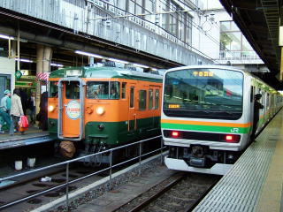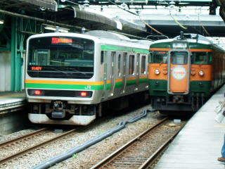 高崎駅で並んだE231系と115系、高崎線ではまだE231系は 宇都宮線と比べ少ないので115系や211系との並びが撮れる。 撮影:高崎駅 |